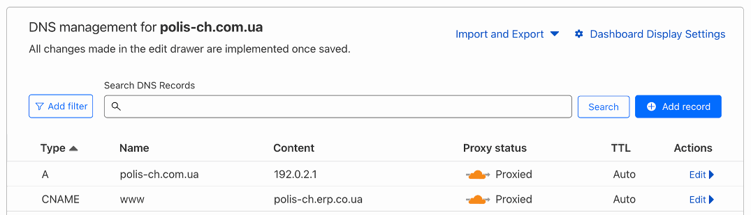 - Запис із типом CNAME для субдомену www з посиланням на вашу базу my-company.erp.co.ua також із включеним проксі Cloudflare (помаранчева хмара).