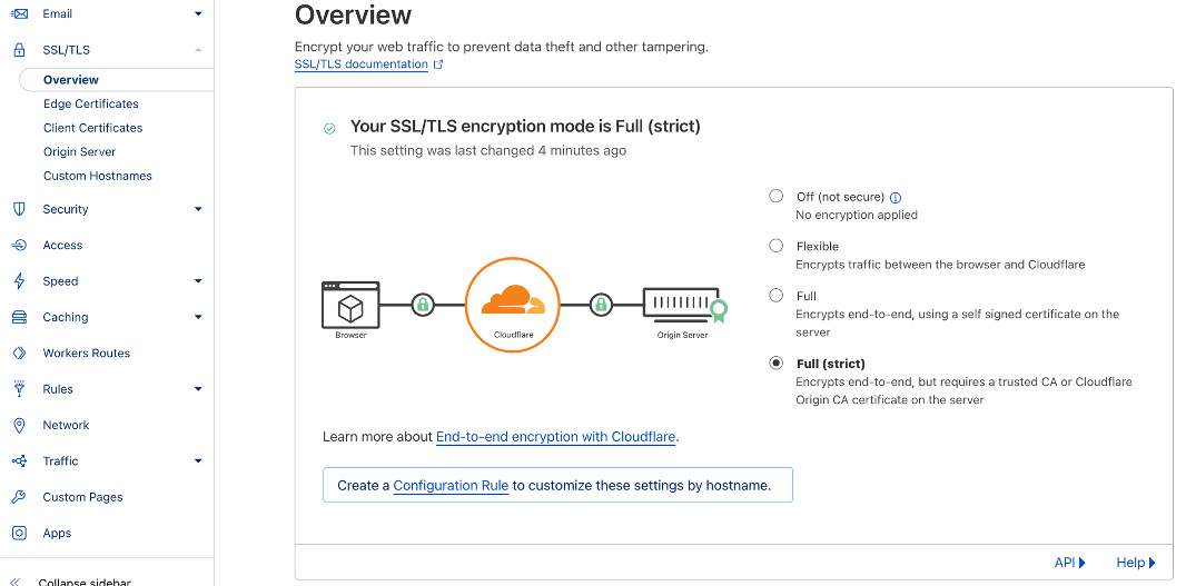 В розділі SSL/TLS → Overview необхідно включити повний режим шифрувавання Full (Strict). У розділі SSL/TLS → Edge Certificates включити опції Always Use HTTPS, TLS 1.3 та Automatic HTTPS Rewrites.