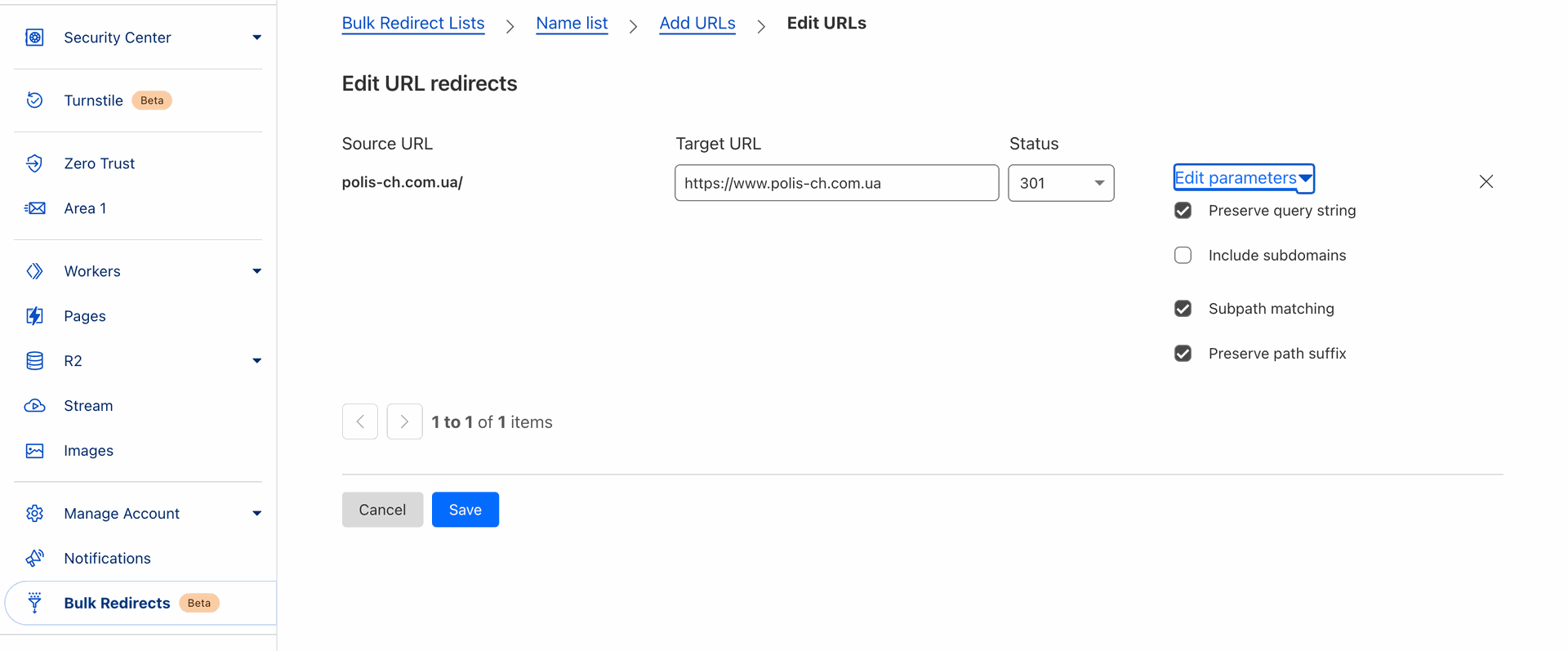 Далі, в розділі Account → Bulk Redirects потрібно натиснути кнопку Create Bulk Redirect Lists і створити правило перенаправлення з my-domain.ua на https://www.my-domain.ua зі збереженням шляху і параметрів запиту.